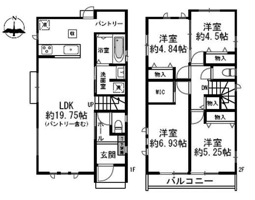 階数 区分 広さ 1F LDK 19.7帖 2F 洋 6.9帖 2F 洋 5.2帖 2F 洋 4.8帖 2F 洋 4.5帖 - 駐車場