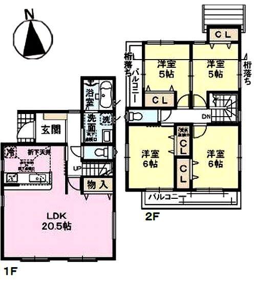 階数 区分 広さ 1F LDK 20.5帖 2F 洋 5.0帖 2F 洋 5.0帖 2F 洋 6.0帖 2F 洋 6.0帖 - 駐車場